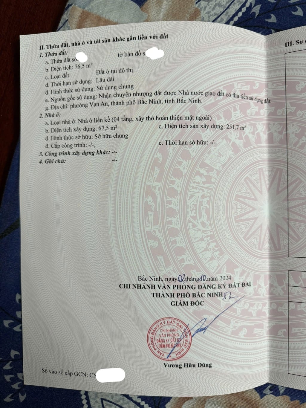 Bán nhà xây thô 4 tầng tại dự án Vạn Phúc, Vạn An, TP. Bắc Ninh với mức giá hấp dẫn 5.3 tỷ đồng. Diện tích sàn 76.5m2, mặt tiền 4.5m, hướng Tây Nam.